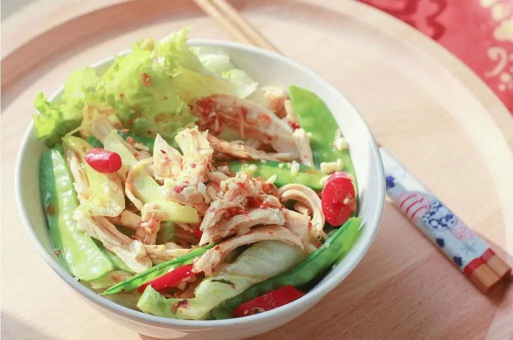 把蔬果、低脂鸡胸肉放在一起,淋上沙拉酱,轻轻拌匀即可,再搭配一个粗粮食物窝窝头类(占一天热量的30%~40%)