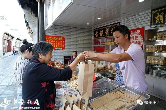 在三河古镇,商铺鳞次栉比,景区的原住民在家门口吃上了旅游饭,做米饺、米酒、三河羽扇等手工艺品,三河民俗文化丰富,国家非物质文化遗产庐剧《小辞店》发源与此。