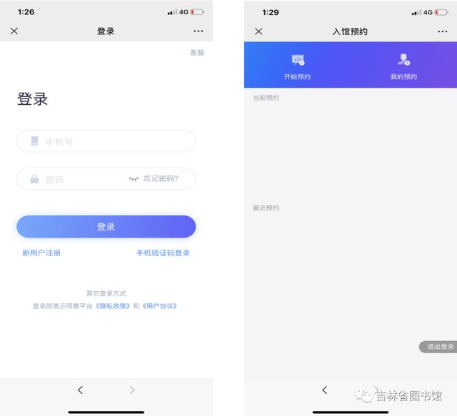 关注吉林省图书馆微信公众号,点击“服务”,进入“入馆预约”,使用吉林省图书馆APP账号密码进行登录,如没有账号,可以选择新用户注册登录,开始预约。