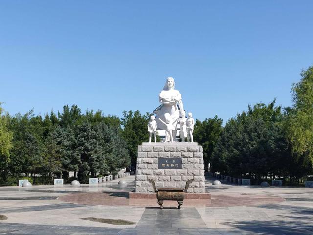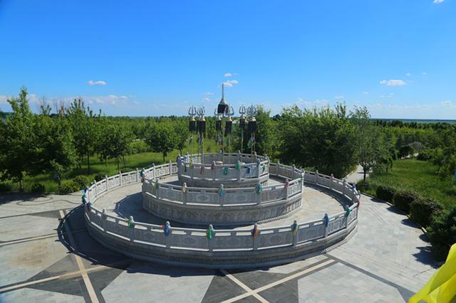 广场为半径18米的正圆型,平面呈蒙古族勒勒车车轮造型。正中塑造的是蒙古史上著名的"三贤圣母"之首——阿阑豁阿汉白玉雕像。郭尔罗斯为圣母阿阑豁阿的故乡。