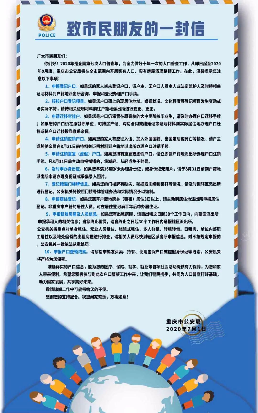 为深入贯彻落实党中央关于第七次全国人口普查的决策部署,按照重庆市委市政府和公安部统一部署,重庆市公安局结合疫情防控工作,精心组织、周密部署,户口暨实有人口房屋清理整顿工作正扎实有序、全面铺开、稳步开展。户口暨实有人口、实有房屋清理整顿工作将持续到2020年9月底,在此期间,公安机关将通过预约上门、电话或网络等形式,逐一全面调查核实重庆市范围内实有人口、实有房屋数据信息。此外,市民也可持本人户口本、身份证到户籍地派出所进行审核。公安机关吁请市民予以支持和配合,主动提供真实、准确、完整的信息。本次清理整顿工作的重点为注销应征入伍、加入外国国籍或死亡等人员的户口以及重复(虚假)的户口,为无户口人员登记落户,登记人户分离、空挂户信息,更正确有差错的户口登记项目信息,核查在住境外人员信息,管理门楼牌信息等。