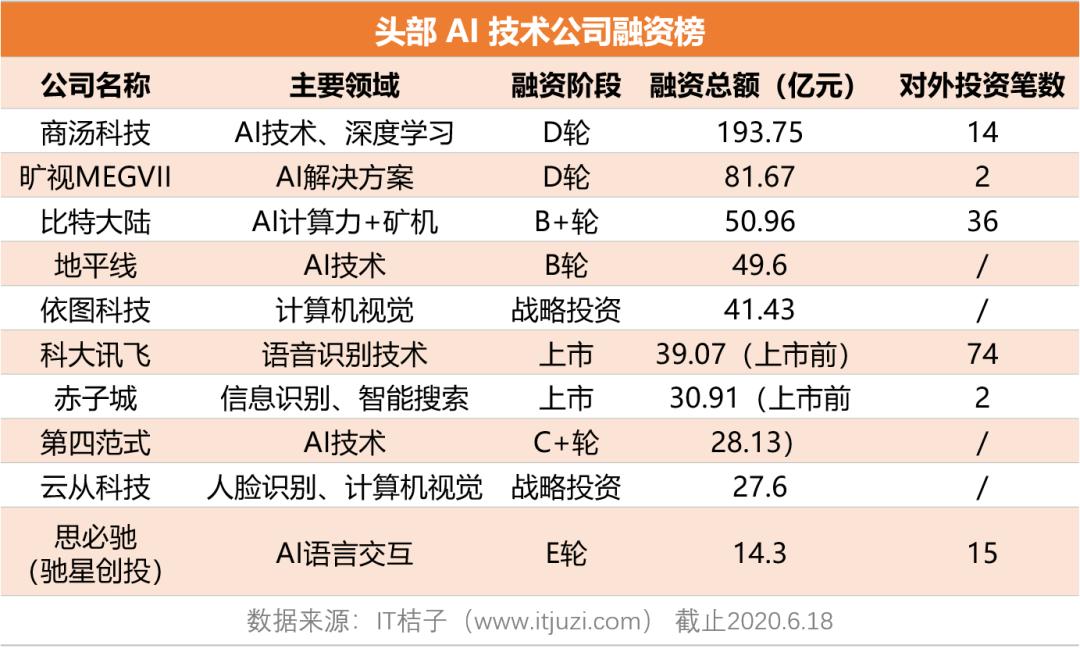 根据 IT 桔子数据,目前人工智能技术领域拿钱最多的是估值 60 亿美元的独角兽商汤科技,截止到 7 月初,其融资总额达 193.75 亿元。另外,中国当前还有 6 家头部 AI 技术公司拿到的钱超过了 30 亿元。