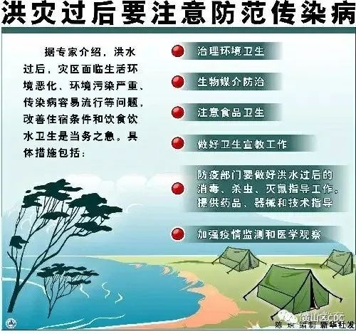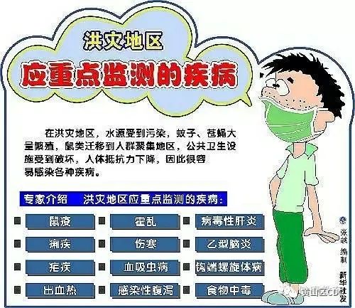 编者按:每年洪涝灾害后,极易造成疫病流行。一些多年不发生或很少发生的疫病,一些在正常年份不会发生的疾病,由于洪水的缘故,亦有可能发生。目前虽然没有疫情发生,但防病防疫是一项长期的工作。那么,洪灾过后,大家要如何预防传染病呢?请一定要详细看看下文哟!另外,请大家分享出去哟!黄山区疾控中心提醒:当前正处于汛期,湿度大、温度高,食品容易受到细菌、霉菌及各种化学物质的污染,水源也可能受到污染。这些可能会对人体健康产生不同程度的危害,如引起肠道传染病、食物中毒等。为此,特提醒大家要注意防疫消毒,杀虫防病;要注意饮食卫生,食物要烧熟煮透,不食用病死禽和霉变的食品;不食用洪水浸泡过的食品;不要喝生水;水源改变时,山水、井水等新水源要在专业机构指导下消毒处理后使用;及时清除室内外淤泥、垃圾、积水,防止蚊蝇孽生;要积极开展消毒、杀虫、灭鼠工作;要开门、开窗、通风、换气,保持空气流通;尽量避免长期接触淤泥、疫水;出现发热、咳嗽、腹痛和腹泻等症状应及时去正规医院就诊。一、水灾过后需要注意和预防哪些疾病?首先要预防的是肠道传染病,如霍乱、伤寒、痢疾、甲型肝炎、手足口病等。人畜共患疾病和自然疫源性疾病也是洪涝期间极易发生的,如鼠媒传染病:钩端螺旋体病、流行性出血热等;水灾过后还可能患皮肤病:浸渍性皮炎、虫咬性皮炎、尾蚴性皮炎。另外还要注意防治食物中毒、农药中毒等。现在来重点介绍几种比较常见的传染病。(一)细菌性痢疾:细菌性痢疾简称菌痢,是由志贺菌属(痢疾杆菌)引起的急性肠道传染病。主要表现为畏寒、高热、腹痛、腹泻、粘液脓血便以及里急后重等,严重者可出现感染性休克或中毒性脑病。菌痢可通过消化道传播,病原菌随病人粪便排出,污染食物、水、生活用品或手,经口使人感染;亦可通过苍蝇污染食物而传播。生活接触是引起散发病例的主要途径,水、食物污染常引起暴发。(二)伤寒和副伤寒:伤寒、副伤寒是由伤寒杆菌和副伤寒杆菌甲、乙、丙引起的急性消化道传染病。水源污染是本病传播的重要途径之一,常呈暴发流行。临床上以持续高热、相对缓脉、特征性中毒症状、脾肿大、玫瑰疹与白细胞减少等为特征。肠出血、肠穿孔为主要并发症。(三)甲肝:甲型病毒性肝炎,简称甲型肝炎、甲肝,是由甲型肝炎病毒(HAV)引起的,以肝脏炎症病变为主的传染病,主要通过粪-口途径传播,临床上以疲乏,食欲减退,肝肿大,肝功能异常为主要表现,部分病例出现黄疸,主要表现为急性肝炎,无症状感染者常见。任何年龄均可患本病,但主要为儿童和青少年。成人甲肝的临床症状一般较儿童为重。