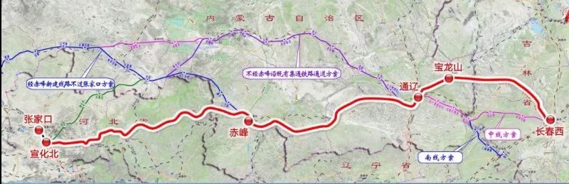 讨论中的具体路线走向有几个方案,这里介绍其一,即“张赤通长”方案。此方案中,高铁线路自张家口引出,经赤峰、通辽接入长春。该线路将新建线路约1037km,设计时速250公里,其中赤峰境内新建线路总长度约240公里。