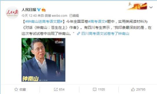 《人民日报》考场速报,引用考生的话:“我印象最深刻的是,在这次考试试卷中出现了钟南山。”