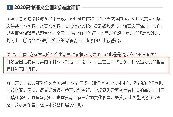 2020年高考第一天,《对话〈钟南山:苍生在上〉作者》入选全国Ⅲ卷高考语文阅读题。