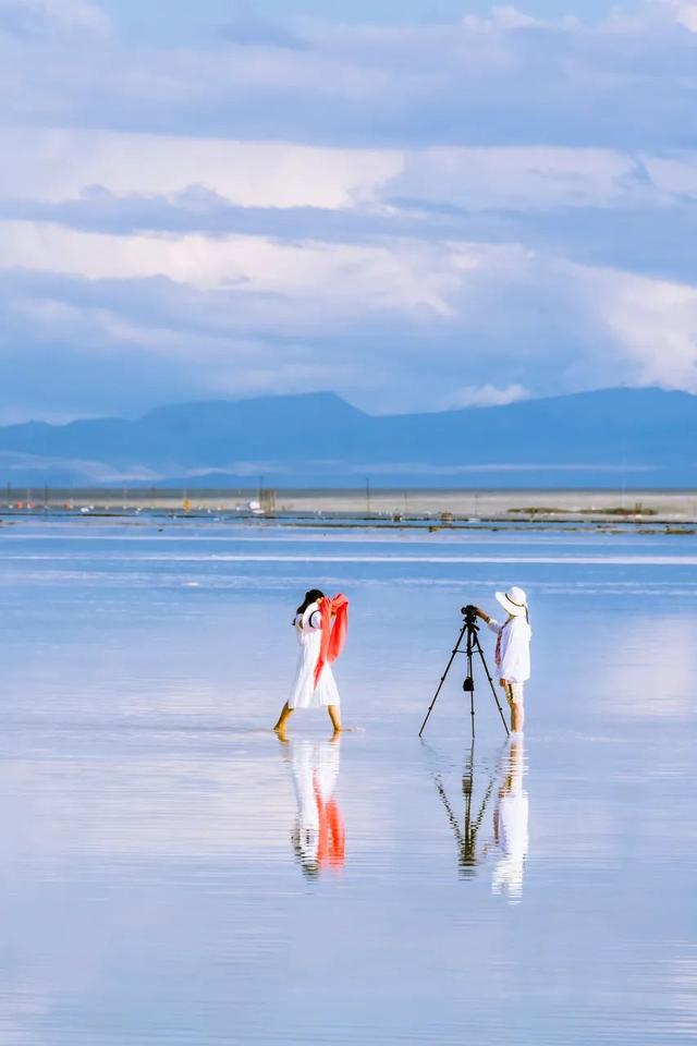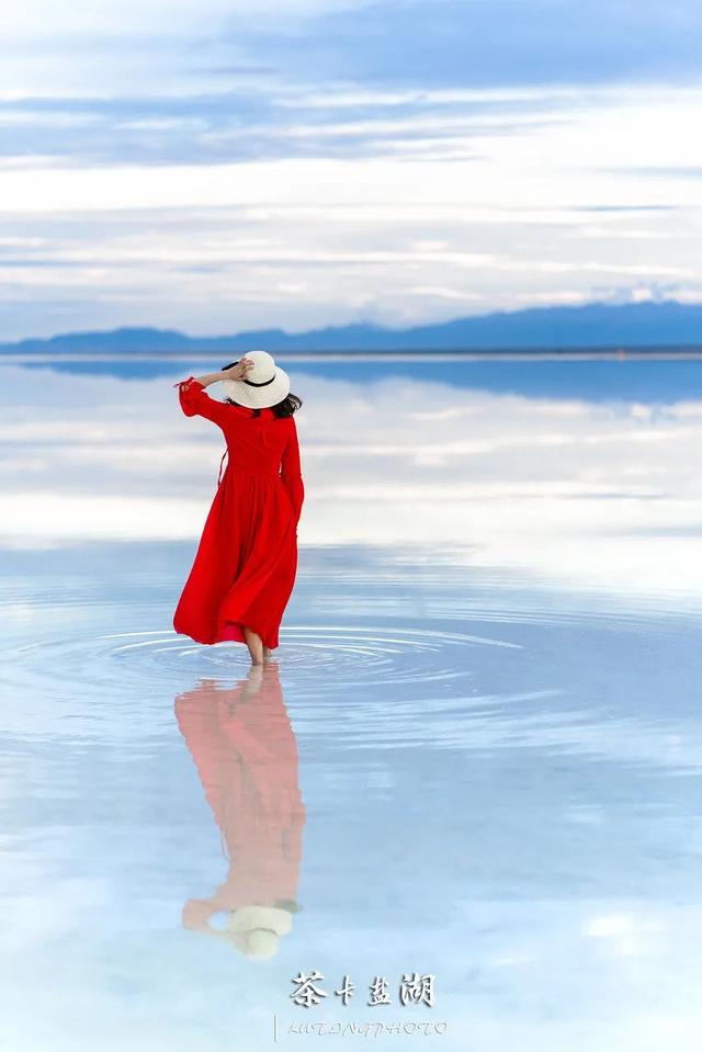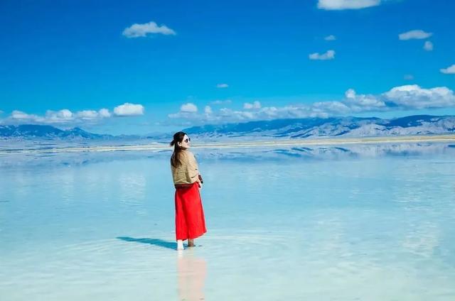 茶卡盐湖的水很浅很浅,所以女孩子可以“站”在水面上,湖底的盐粒平整铺在湖底,反射出明亮亮的阳光。
