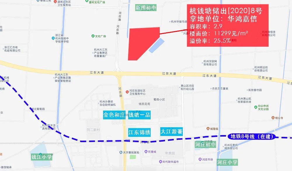 杭钱塘储出[2020]8号河庄街道北一路南住宅地块,东至规划道路,南至规划道路,西至闸北7字河绿地、规划商业地块,北至规划北一路。建筑面积为122113.2㎡。其中10%需配建公租房,约为12211.32㎡。