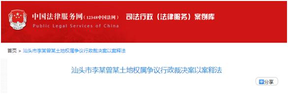 近日,由汕头市提供的案例《汕头市李某曾某土地权属争议行政裁决案以案释法》入选司法部全国司法行政(法律服务)案例库,并在中国法律服务网(12348中国法网)刊登推广。