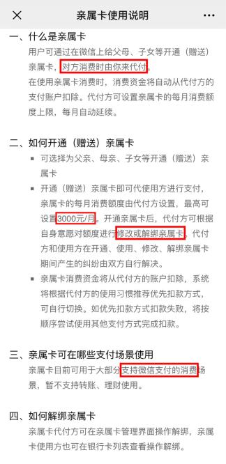 “亲属卡”是微信上线的一个功能,具有“代付”性质,最高每月3000元。简单来说就是他人消费,开通者买单。