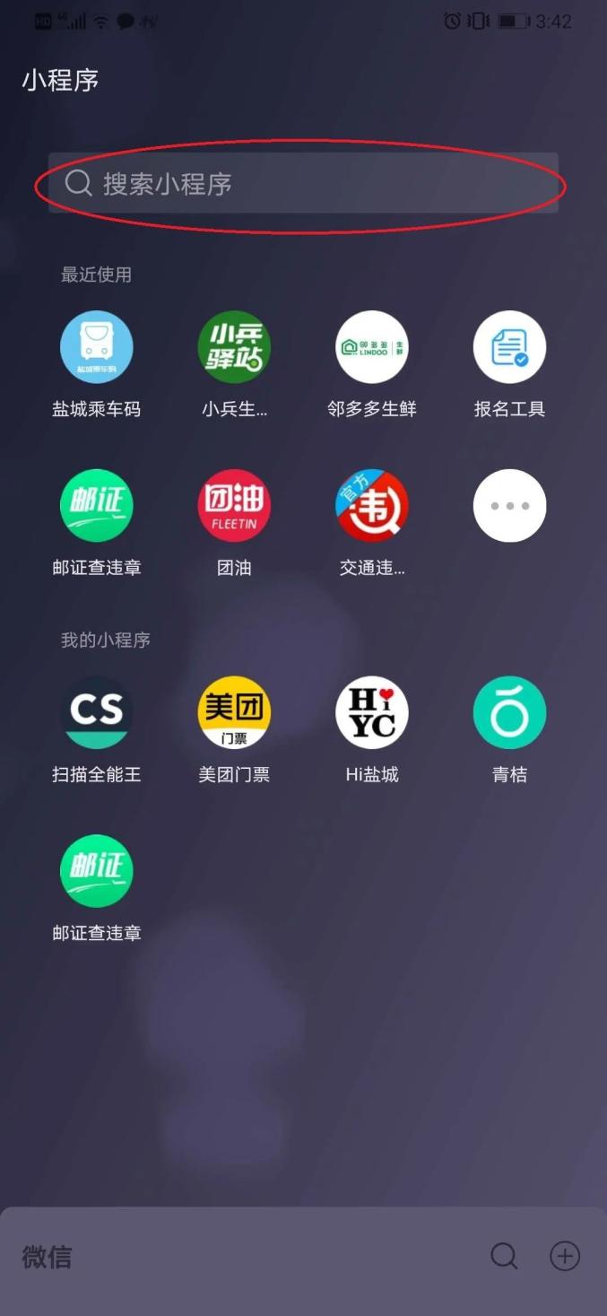 微信主页面下拉小程序,在搜索栏输入“盐城乘车码”