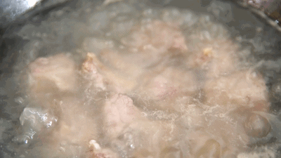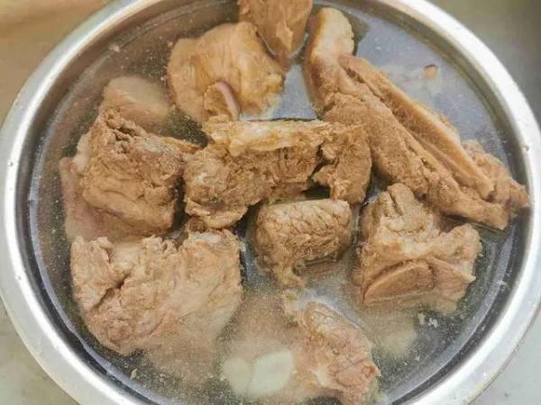排骨清洗干净后,放入冷盐(少量)水锅中,以最小火煮约5分钟,可发现整锅水因肉中的血水渗出而泛红,且上面还浮着一层杂质,闻起来有腥味,但肉还是很生,可如此换水数次,直到肉的腥味去除,即可进行烹饪。