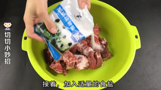 第一步:把排骨放入容器中,加入适量食盐,食盐有杀菌的作用,还能去除排骨的血水和腥味。
