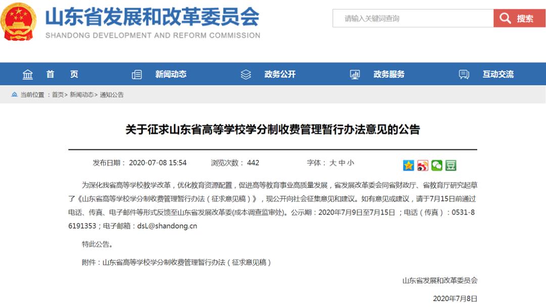 为深化我省高等学校教学改革,优化教育资源配置,促进高等教育事业高质量发展,省发展改革委会同省财政厅、省教育厅研究起草了《山东省高等学校学分制收费管理暂行办法(征求意见稿)》,现公开向社会征集意见和建议。如有意见或建议,请于7月15日前通过电话、传真、电子邮件等形式反馈至山东省发展改革委(成本调查监审处)。公示期:2020年7月9日至7月15日 ;电话(传真):0531-86191353;电子邮箱:dsL@shandong.cn