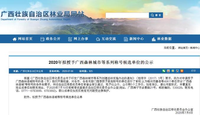 近日,根据《广西壮族自治区绿化委员会关于印发广西森林城市等系列创建活动实施办法的通知》(桂绿字〔2017〕5号)要求,广西壮族自治区绿化委员会办公室在广西林业局官网公布了广西森林县城等称号候选单位名单,全广西一共406个单位符合“广西森林县城”等称号的条件和要求。