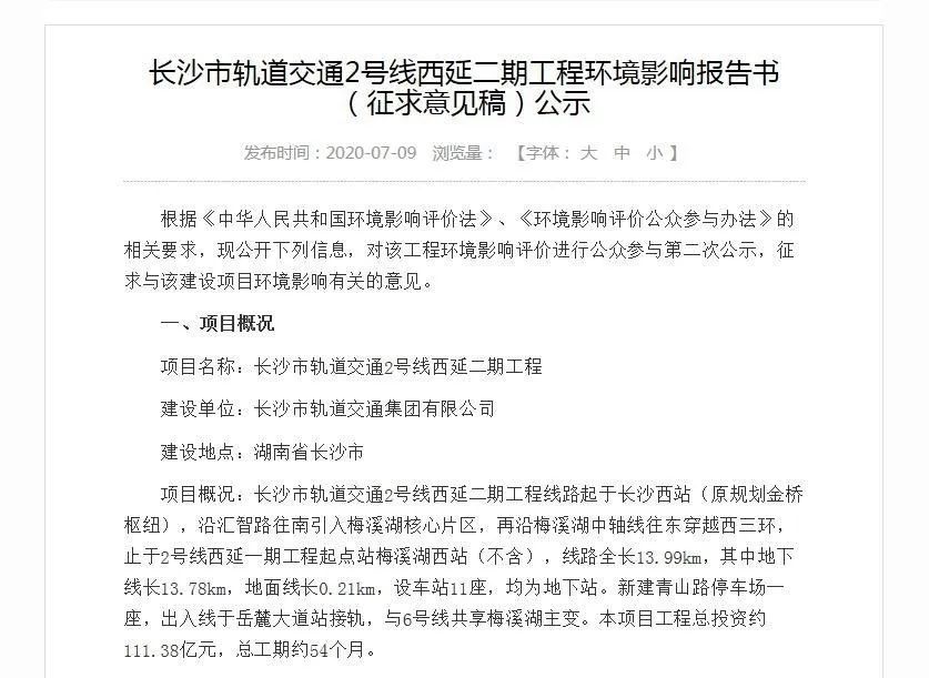 记者从长沙市交通轨道集团官网上获悉,长沙市轨道交通2号线西延二期工程环境影响报告书(征求意见稿)已经进行了公示。文件中透露,项目计划于 2020年9月开工建设,2025年2月建成通车。
