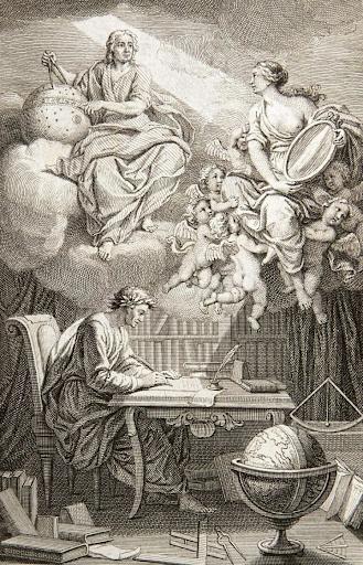 书中附有一幅插图:画中一位头顶诗人桂冠、身着罗马时代长袍的男子伏案写作,他就是作者伏尔泰;其上方是神一般的牛顿,手持圆规,地球仪,好像正在制定万物运行的法则;一道神圣的光从牛顿身后射出,再由一面镜子反射到伏尔泰桌前,手持镜子的女神就是夏特莱夫人。