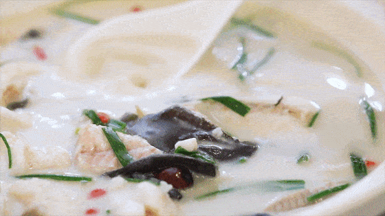 这样原本水油不溶的脂肪得以均匀地分布在汤中,大火煮沸的汤水不断地这样将脂肪打碎又被蛋白质包围,在光线的折射下慢慢便会呈现出诱人的乳白色。