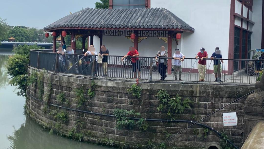 7月9日下午6点,政事君来到被锦江环抱的百花潭公园,在公园外的锦江河畔,政事君看到七八个人一字排开,握着鱼竿,趴在围栏上,一边聊天,一边钓鱼。附近,还有个别独自钓鱼的钓友,静静观察着水面动静。