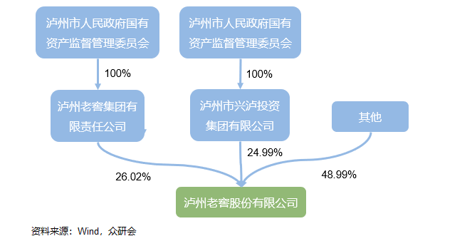1993年9月20日,泸州老窖酒厂以自身经营性资产独家发起以募集方式成立股份有限公司,经过多次股权变更,目前泸州老窖集团和兴泸投资集团合计持有公司51.01%股权,实际控制人和最终控制人均为泸州市国资委,股权高度集中。