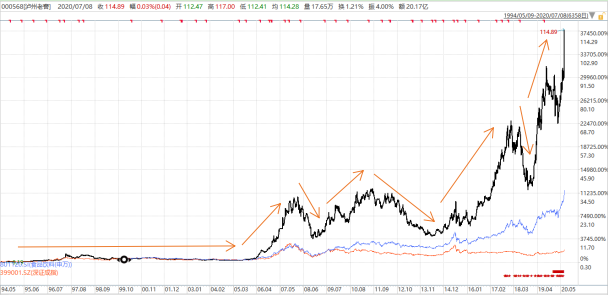 泸州老窖自1994年5月上市以来,20年间几经沉浮,我们参考行业发展历史将公司的发展阶段划分,并对股价波动做出解释。