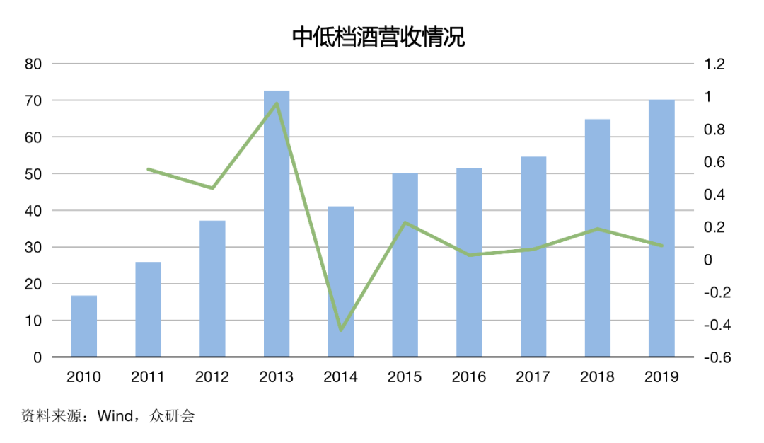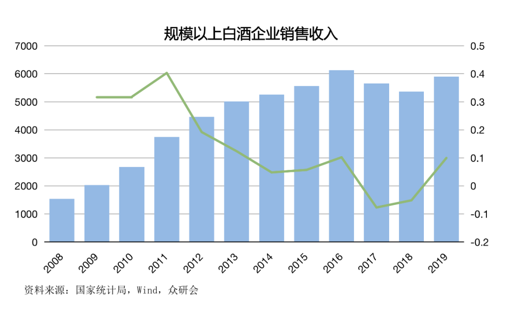 2019年我国规模以上白酒生产企业销售收入达到5897亿元,经历了2017、2018两年下降之后重新恢复增长,但同期行业产量在下降,一定程度上反映出行业在向高价酒集中。