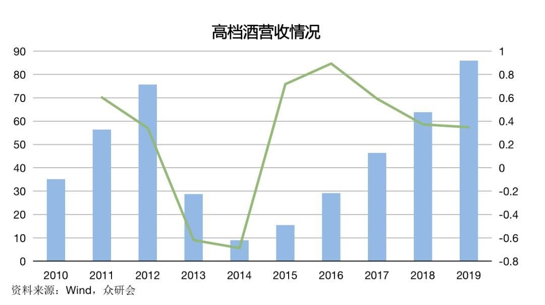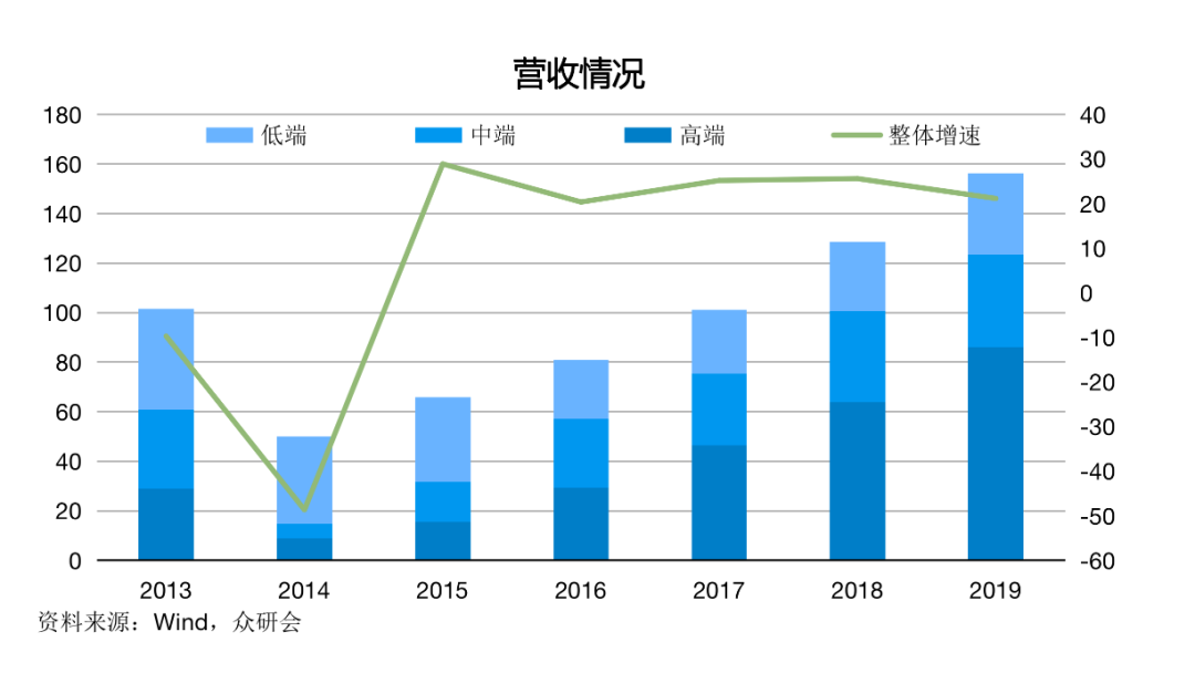 公司高档酒系列“国窖1573”,为仅次于飞天茅台和第八代普五的高端白酒品牌。2019年实现营收85.96亿元,同比增长34.78%,2014 年的大起伏则是前文提到的错误的逆势涨价策略导致的。