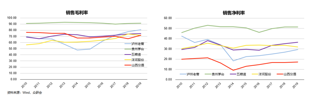 我们可以看到泸州老窖(蓝色线)的销售毛利率和净利率在行业中表现并不突出,甚至可以说是相对较差的,特别是在2012-2015年行业深度调整期,泸州老窖下滑幅度最大,反映出在大环境变化的情况下抗风险能力较弱,同时也是由于逆势涨价的错误战略所致。