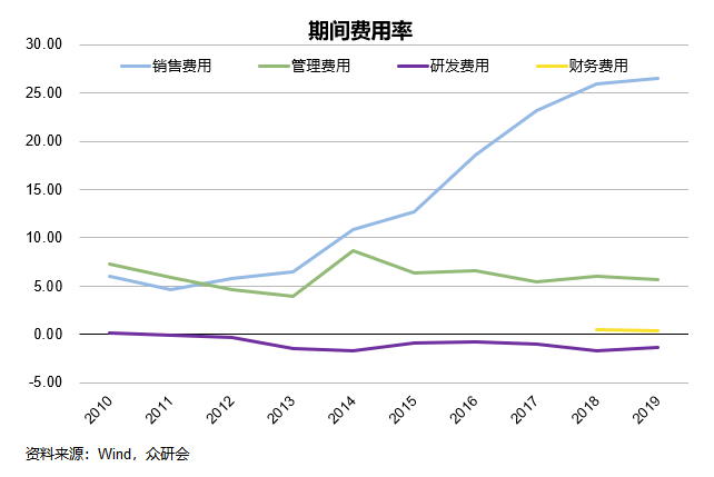 也可以看到泸州老窖的销售净利率增速明显低于销售毛利率,其原因则是由于公司的销售费用极高,增长幅度自2013开始几乎已经翻倍,公司解释是出于提升品牌影响力促进销售的考虑,但追根究底仍是2014年行业调整期公司逆势提价导致商品滞销而引发的一系列后续结果。