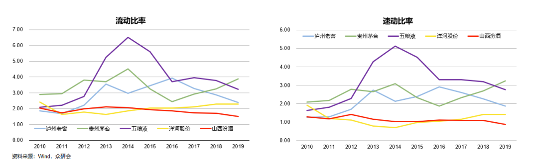 从偿债能力方面来看,泸州老窖表现都不错,2019年下降的主要原因是由于销售规模增长预收款项增加使得流动负债增加所致。