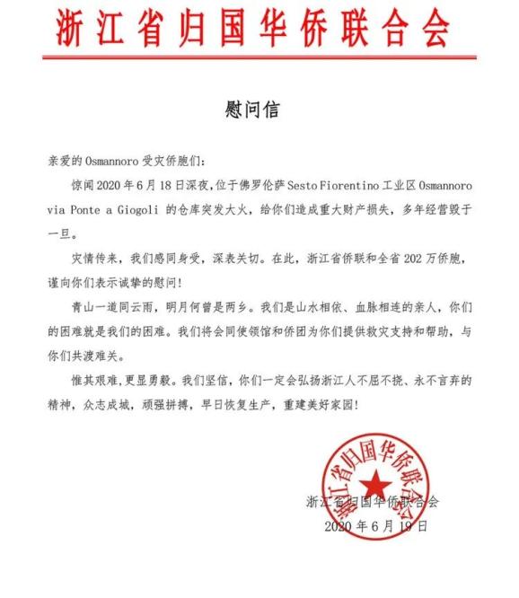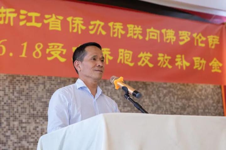 佛罗伦萨华人华侨商贸联谊会周汝炎会长在仪式上宣读了浙江省归国华侨联合会发来的慰问信。