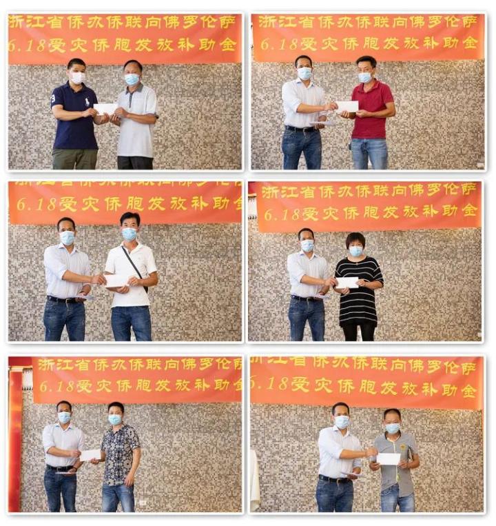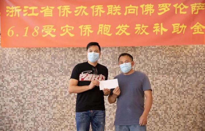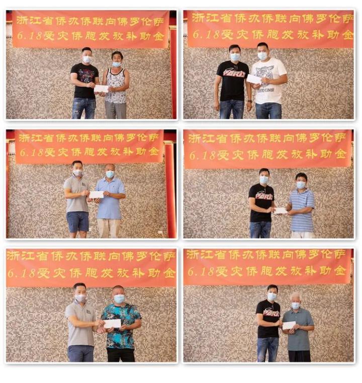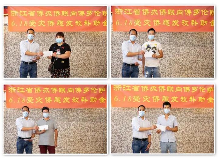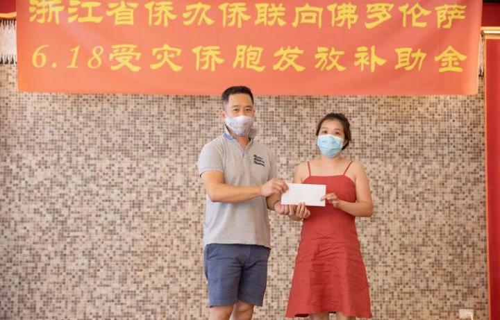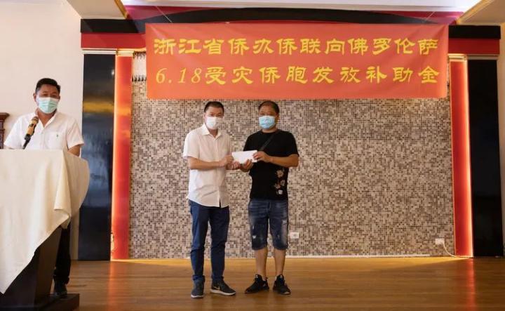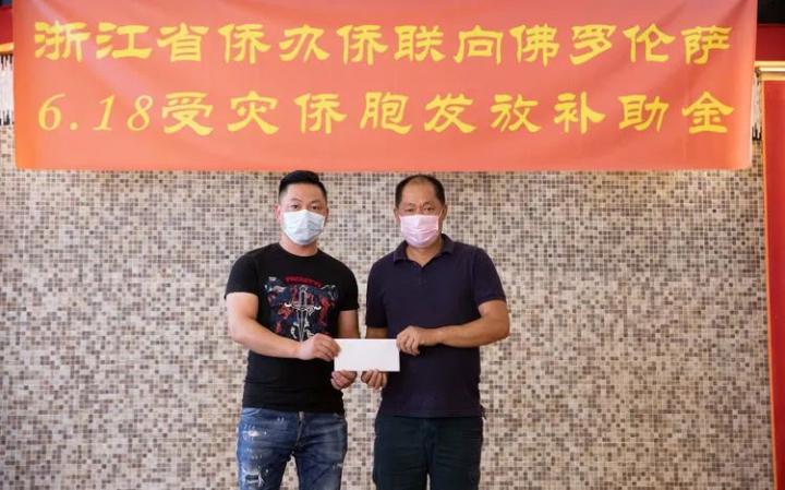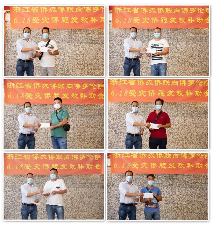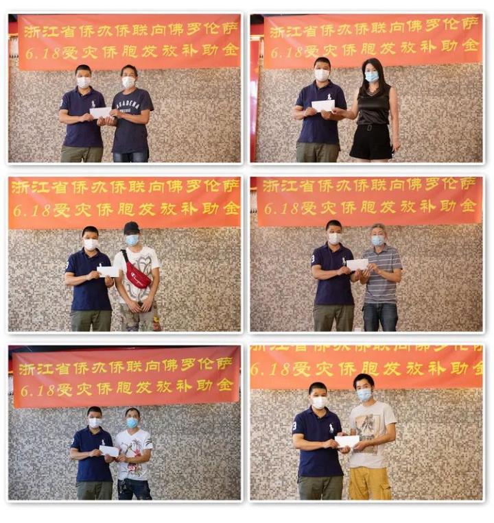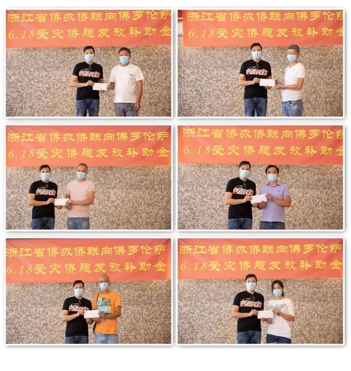 2020年7月11日浙江省侨办、省侨联对6.18受灾侨胞援助金发放仪式在意大利佛罗伦萨福临大酒店举行。下午15:30分,佛罗伦萨6.18火灾中受灾的63户侨胞代表遵循防疫要求带着口罩来到了福临大酒店,佛罗伦萨华人华侨联合总会、佛罗伦萨华人华侨商贸联谊会、佛罗伦萨华侨华人妇女联合会、意大利中意青年联合会、意大利中部文成同乡会、意大利中华炎黄文化研究会、佛罗伦萨中意文化交流协会的会长或侨领代表出席了本次发放仪式。