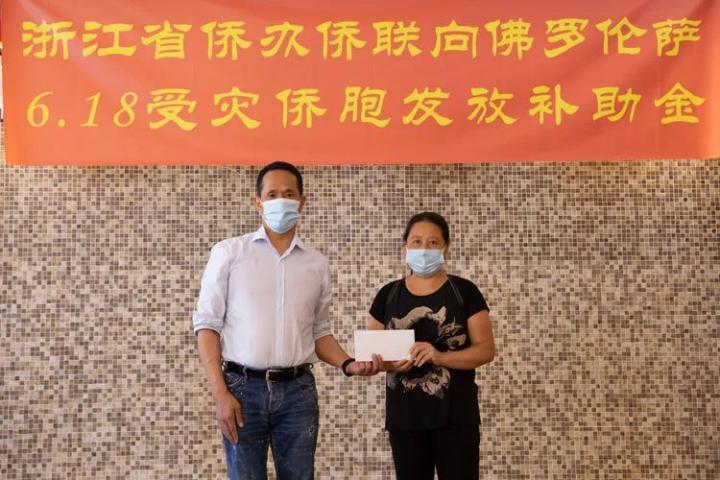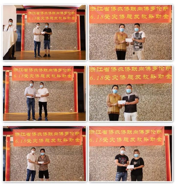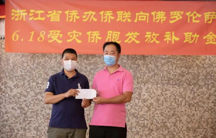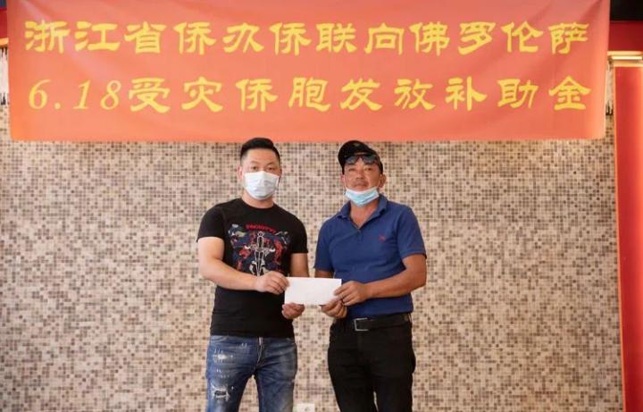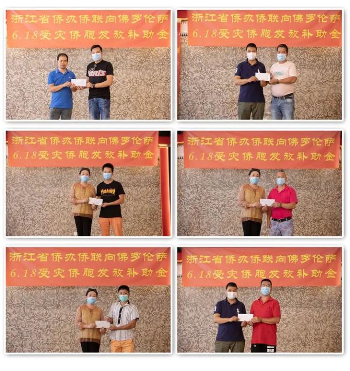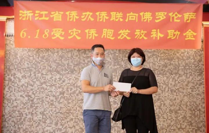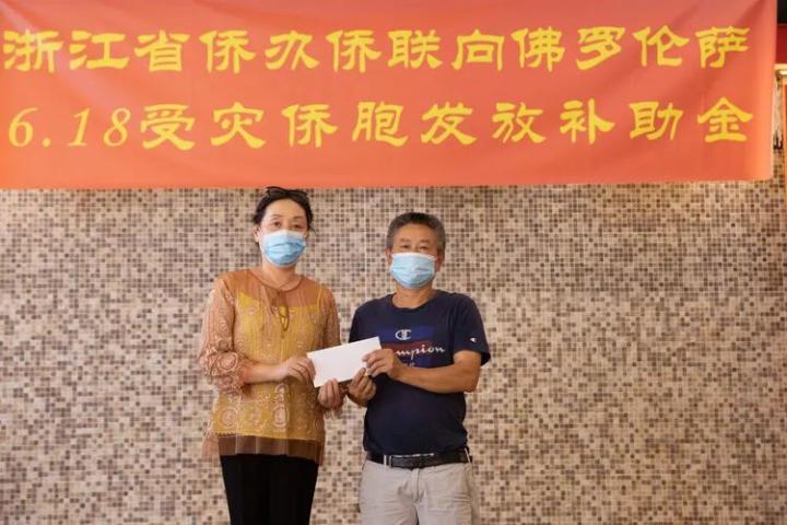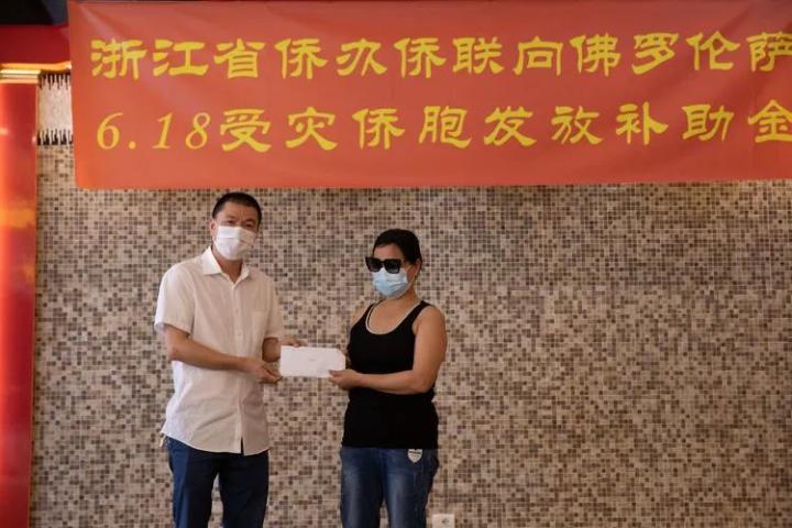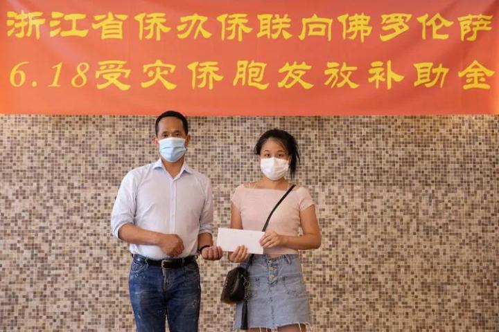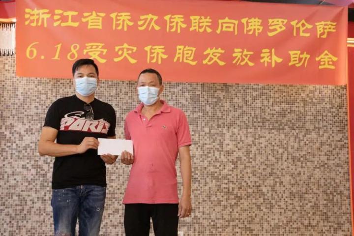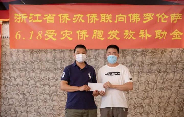 2020年7月11日浙江省侨办、省侨联对6.18受灾侨胞援助金发放仪式在意大利佛罗伦萨福临大酒店举行。下午15:30分,佛罗伦萨6.18火灾中受灾的63户侨胞代表遵循防疫要求带着口罩来到了福临大酒店,佛罗伦萨华人华侨联合总会、佛罗伦萨华人华侨商贸联谊会、佛罗伦萨华侨华人妇女联合会、意大利中意青年联合会、意大利中部文成同乡会、意大利中华炎黄文化研究会、佛罗伦萨中意文化交流协会的会长或侨领代表出席了本次发放仪式。