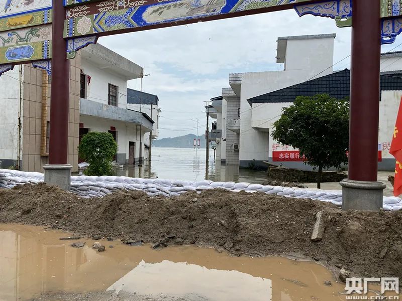 记者在彭泽县棉船镇看到,镇子边缘的堤坝外围,部分处于地势相对较低位置的楼房、公用设施已经被洪水淹没,部分堤坝临时做了加固和加高的处理。