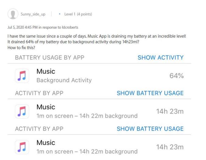 最近几天我有同样的问题,Apple Music正在以令人难以置信的水平耗尽我的电量!它在14小时23分内由于后台活动用掉了我64%的电量。