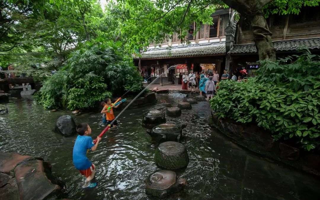 日前,政事君前往黄龙溪古镇景区实地探访。夏天的黄龙溪,是一个“撒欢”的好去处。顺着古镇内的主溪流一眼望去,拿盆的、用水枪的、甚至徒手捧水作战的人,玩得不亦乐乎。走到龙潭广场,就可以看到龙头源源不断喷涌的水流。干净清凉的溪水泼在身上,浇灭了暑天的燥热。