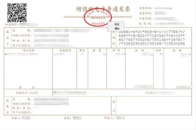 1.使用OFD阅读器打开下载的版式文件,右键点击电子发票上的税务监制章,选择验证,如图所示。