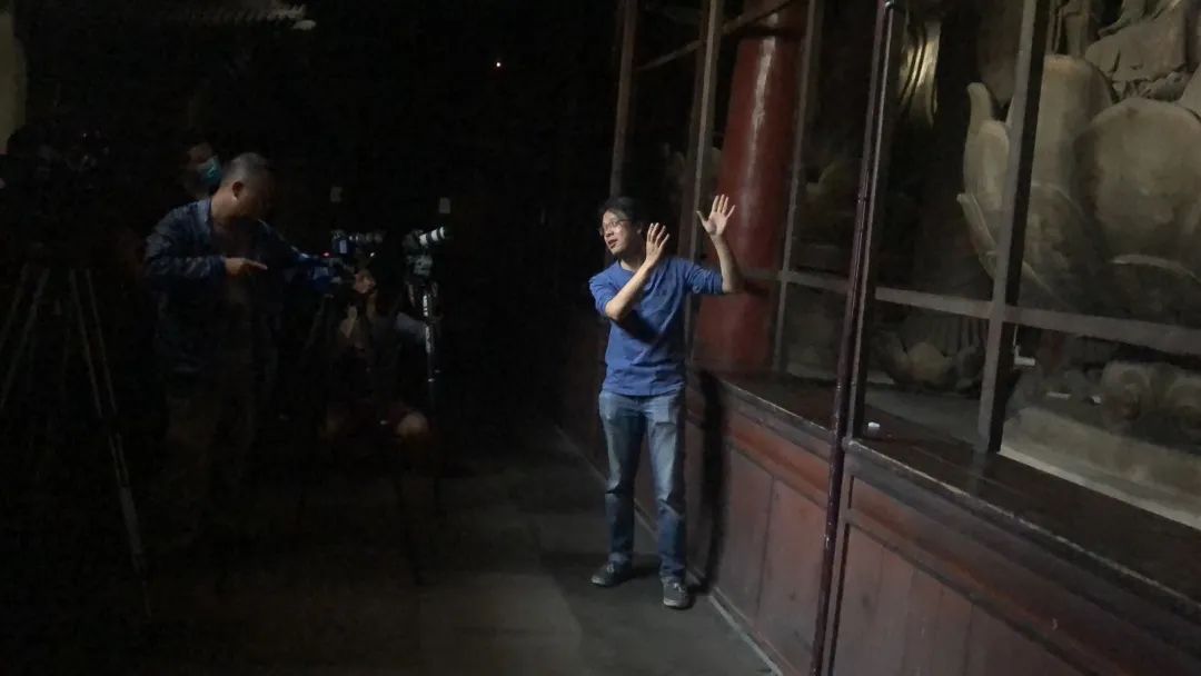 提前一天进行的彩排尽可能模拟实拍流程,特别需要对我和主持人张老师的对话严格计时,摄像师们则努力配合我们对话的内容抓拍对应的建筑整体或者细节。记得我们大家一起,在17号窟高高的明窗东侧壁寻找,并最终用镜头捕捉到美丽的交脚弥勒和思维菩萨时,摄像师和导播都格外兴奋。9、10号双窟的后殿本有一圈极其低矮幽暗的隧道,我很希望可以和张老师进去转一圈,这样可以和之前大佛窟巨大的尺度形成对比,无奈由于信号实在太弱,唯有割舍。9号窟前廊的雕刻可谓“世界建筑博物馆”,我们经过反复排演,最终摄像师们已经可以达到“指哪儿打哪儿”的程度。排练到9、10号窟时,我早已精疲力尽,可后面还有3号窟以及大段的结尾总结段落,此外还有互动问答——我于是充分认识到,真正直播时对精力和体力都是巨大的考验。第二天直播之前,团队专门为我准备了我的提神法宝——红牛,此后在木塔也是如法炮制。