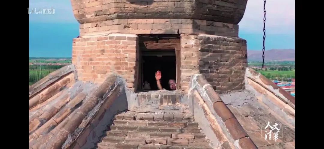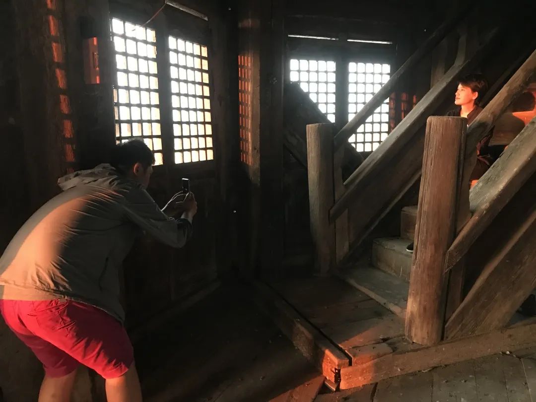 今年五月在清华和“人文清华”讲坛团队开木塔这一期策划会时,我们已初步计划由外而内,层层剖析木塔,尤其大胆构想结尾时登上顶层天花以上的屋架,从当年梁思成、莫宗江二位先生爬出去测绘塔刹的窗口跟观众分享先贤昔日学术报国的故事,最后向观众挥手告别作为整集的高潮和结束——当时想到这个镜头的时候,大家都热血沸腾。在大同时,和各部门的策划会上,我们再次提起这个构思,摄像师牛子两眼直放光,马上开始提出具体拍摄方案,甚至立刻打电话跟“飞手”(控制无人机的摄像师)开始仔细交流细节,最后“飞手”当然也如约赴应县。