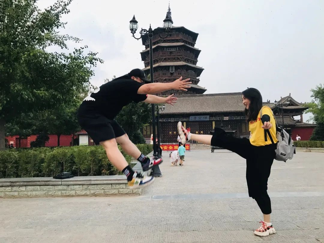 山西广播电视台的摄像师牛子(牛晓峰)和张鹏二位老师跟大家开心地打成一片。除了高质量完成本职的拍摄任务之外,他们还有自己的另一个世界——每天早晨天没亮就出去等日出,夜深了又蹲守拍星空,常常跟我们分享他们醉人的杰作。有一天木塔彩排毕,夕阳照进木塔,无比动人,两位老师给我们拍了不少人物大片,不亦快哉。飞手老师张健话不多,但极专业沉稳,木塔的许多唯美大片镜头皆出自他手。