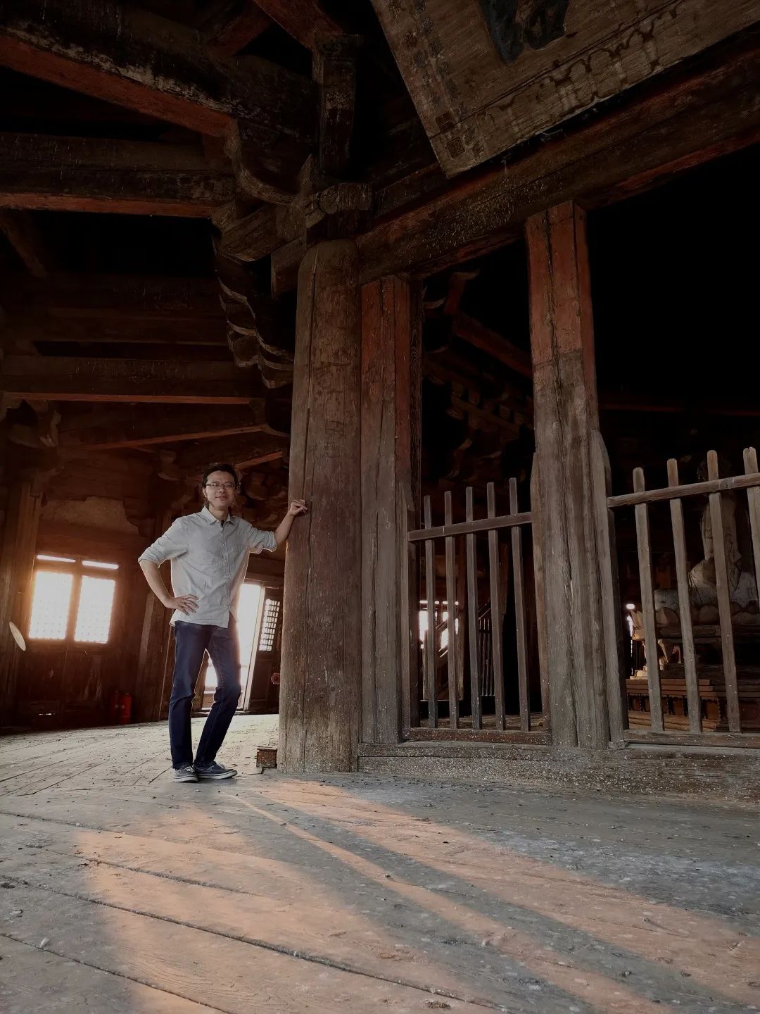 最后是山西文物局的田晓勇老师,作为全部直播工作的统筹,他一路为我们开路搭桥,在各处古建筑与当地文物管理部门沟通,处理大量琐碎的后勤事务,全力配合我们的拍摄,劳苦功高。由于田晓勇年纪和李浚、阿斌相若,所以和年轻人们打成一片,嬉笑怒骂,欢(争)笑(吵)不断。大家见他性格好,皆以模仿他的吕梁口音为乐——尤其是将李浚说成“李囧恩”(酷似韩语),好在他和李浚皆不生气,给大家带来许多欢乐。论古建筑知识,他在团队中绝对算得上高级班的,各种术语门儿清,并且勤学好问,据他说每次遇到老专家,总会抓住机会努力求教,故所学颇广博。看得出在配合我们工作之余,他自己也在一趟趟古建筑踩点、考察中获得很大的乐趣。