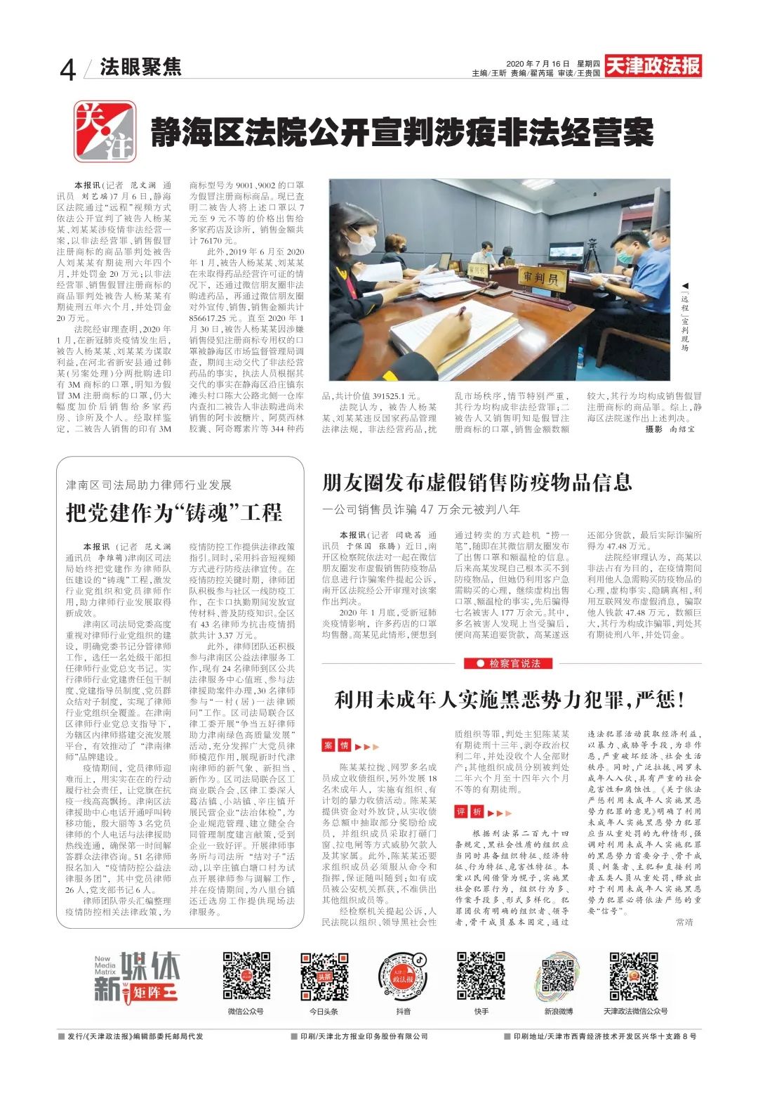 市检一分院第四检察部依法以销售假冒注册商标的商品罪对被告人朱某某提起公诉。和平区人民检察院青年干警志愿服务队到南营门街世昌里社区,为孩子们开展自我防护教育,取得良好效果。河西检察院第三检察部到文苑楼社区开展“警惕!非法集资新花样!”专题讲座。公安西青分局李七庄派出所结合辖区特点,组织社区民警采取错时工作法,在界内社区开展了“电诈在我身边”警民携手防范电信网络诈骗宣传活动。西青法院召开2020年中期工作推动会,院党组书记、院长以“干在实处、走在前列、凝心聚力、奋勇争先,为争创一流工作业绩不懈奋斗”为题,全面总结2019年以来各项工作情况、安排部署2020年下半年工作。津南区双林街调委会常驻街矛盾纠纷化解调处中心接待来访群众以来,调解员结合来访咨询情况和全街人民调解案件情况及时梳理分类,定期到社区开展矛盾纠纷排查工作。宁河区人民检察院对张某某等三人恶势力犯罪团伙敲诈勒索、诈骗一案依法派员出庭支持公诉。蓟州区司法局上仓司法所工作人员到上仓初级中学开展禁毒宣传活动。滨海新区司法局新城司法所与新城派出所建立对接工作机制,涵盖支部共建制度、工作例会制度、联络员制度、信息通报制度、突发事件联合处置制度等,以支部共建引领工作对接。河东区检察院针对两起故意伤害案件召开拟不起诉公开听证会,公开听取人大代表、政协委员、人民监督员、值班律师和侦查人员的意见。南开区网格中心主办两场“南开区社区网格长论坛”,对标基层社会治理体制机制创新,带来精细化治理的思想碰撞和实践分享,提升网格工作的高度、深度和温度,探索形成独具特色的工作方法。全区12个街道优秀网格长参与活动。公安静海分局打击支队三大队奔赴河北省石家庄市某小区,抓获涉嫌帮助信息网络犯罪活动的犯罪嫌疑人卢某玉。公安西青分局交警支队持续开展“一盔一带”交通安全宣传劝导工作。公安蓟州分局穿芳峪派出所接群众报警称:一只獾被困在一废弃水井内,请求民警协助救援。接警后,民警临时制作简单的救援工具,迅速赶往现场,并将这只国家二级保护动物野生獾顺利救出并放生。西青区辛口镇开展以“诚信经营,创建放心购物环境”为主题的志愿服务活动。津南区辛庄镇兰悦家园社区新时代文明实践站联合津南区律工委、津南区司法局辛庄司法所开展《民法典》普法宣传讲座。