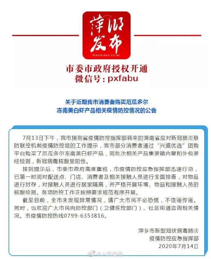 搜全国【江西萍乡南美冻虾包装新冠病毒阳性】据萍乡发布:7月13日下午,我市接到省疫情防控指挥部转来的湖南省应对新冠肺炎联防联控机制疫情防控组的工作提示,我市部分消费者通过“兴盛优选”团购平台购买了厄瓜多尔冻南美白虾产品,同批次相关产品集装箱内壁和外包装经检测,新冠病毒核酸呈阳性。目前,已第一时间对配送点、门店、消费者及相关接触人员进行全面排查,对物品进行封存,对接触人员进行居家隔离,并严格开展环境、物品和接触人员的核酸检测。