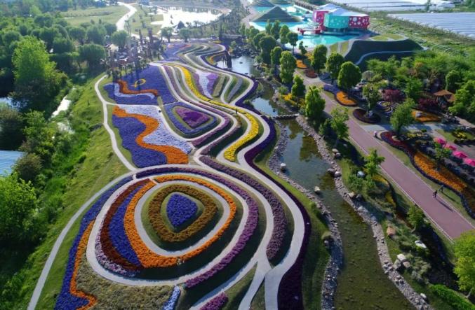 梯田花海占地1.5万方,线条优美、色彩分明、营造出“时时有花开,四季花不同”的盛况。平整草坪、各色花卉,游客徜徉其中,似梦似幻,如入仙境。