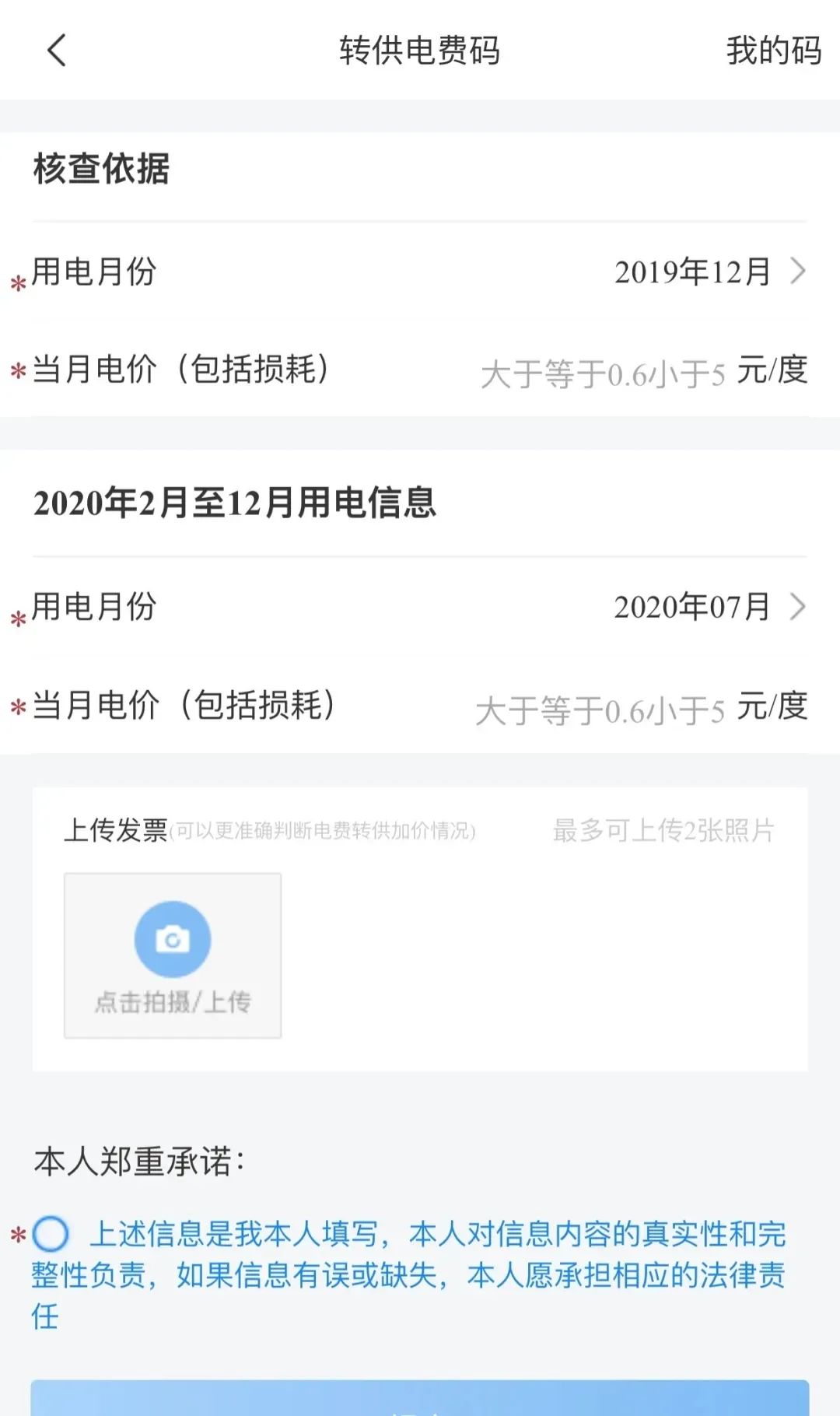 在活动填写【基本信息】、【核查依据】、【2020年2月后用电信息】,确认承诺内容属实后,点击【提交】