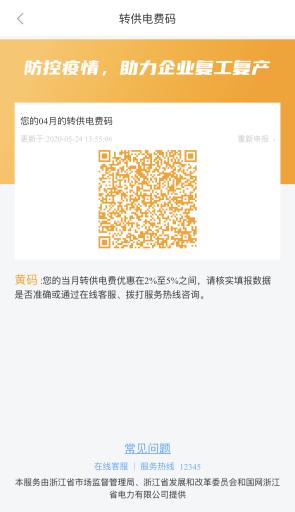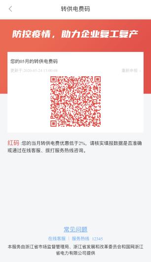 根据用户填写的信息,对比申报当月(选择范围为2020年2月后)的电价与2019年基准月(选择范围为2019年8月—12月)的电价,会生成三种颜色的转供电费码。(因存在损耗、公摊电费等情况,本结果可能与实际情况存在一定偏差)