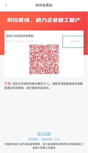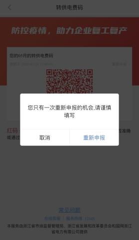 在生成的转供电费码详情页面,点击“重新申报”,即可重新修改信息。每个转供电终端用户每月只可生产一个二维码,每个码一个月只可修改一次。