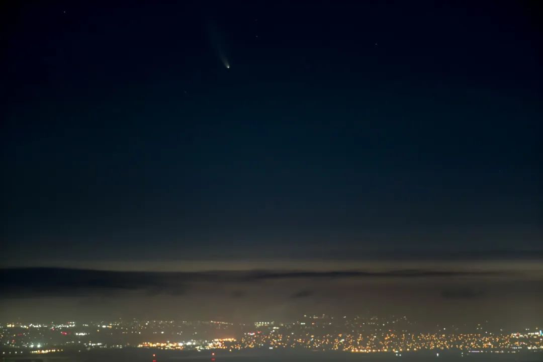 ☞7月14日凌晨,在美国加利福尼亚州旧金山湾区,尼欧怀兹彗星划过天际。