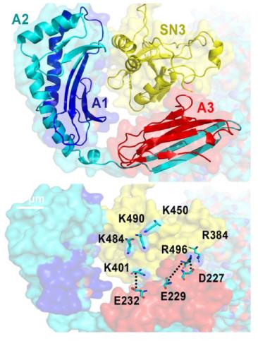 根据结构模拟,二者相互作用界面处于SND1的SN3区域和HLA-A的A1与A3之间,这说明SND1能够与未成熟的HLA-A之间发生相互作用。也就是说,在HLA-A刚刚被生产出来,还没有组成MHC-1完全体的时候,SND1就已经可以对它做些什么了。