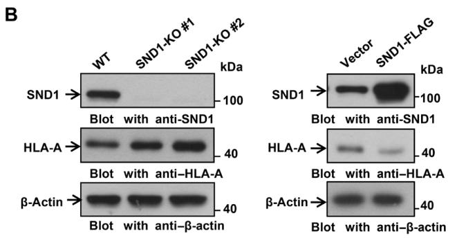 敲除SND1后,可以观察到癌细胞表面HLA-A的水平增加,而SND1过表达细胞中HLA-A的水平降低了。不过虽然蛋白水平变化,但是mRNA的水平是没有明显改变的,综合前面的发现,研究者猜测SND1可能并非阻止HLA-A的合成,而是诱导了HLA-A的降解。